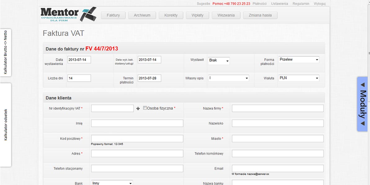 Za pomocą modułu fakturowania usprawnisz swój firmowy proces wystawiania faktury. Mentor to program, który oferuje znaczne usprawnienie tych działań. Funkcjonalność aplikacji jest niezwyke przyjazna dla danego odbiorcy ze względu na jej automatyczne wypełnianie większości pól niezbędnych do wypełnienia. Dzięki temu można oszczędzić czas na wystawianie dokumentów.
