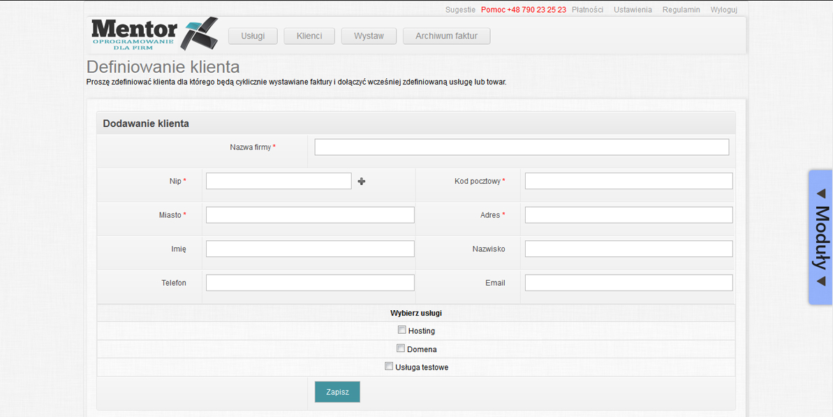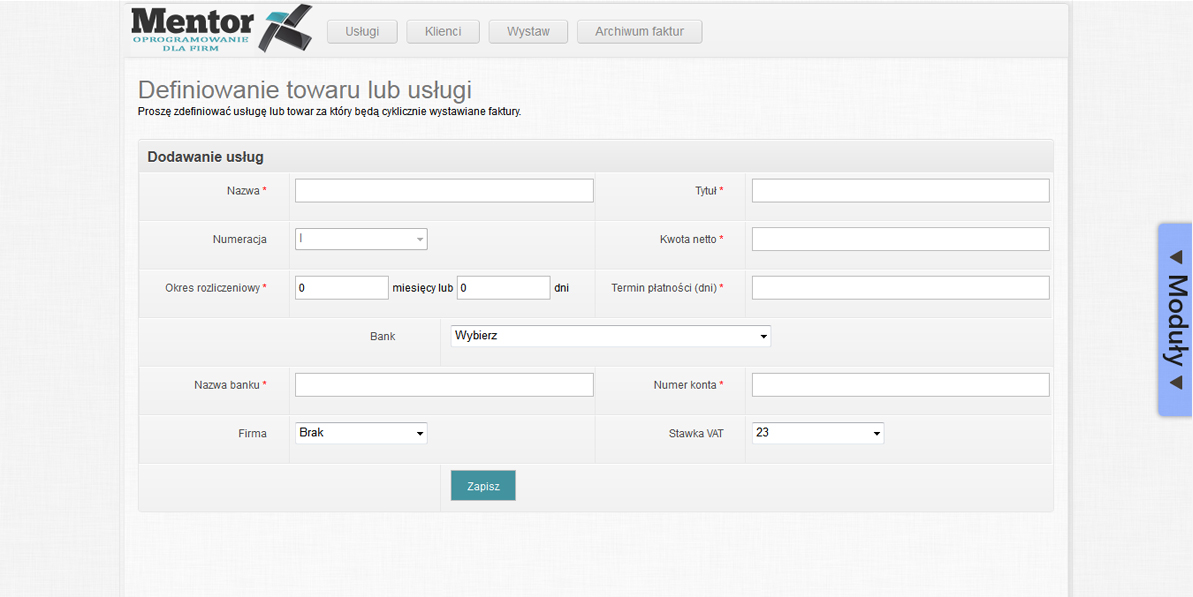 usługę lub towar za który będzie generowana faktura, określić czas oraz zdefiniować klienta dla którego